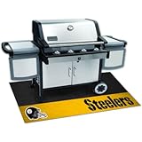 Mat doesn't lay flat on the ground, and its as big as in the picture. I have a smaller grill and non of the steelers logo can be seen. It was a huge disappointment.I gave this as a gift (Xmas) and I don't think he has actually used it yet because it's not barbecuing weather,but I am sure once the weather permits he will be out there grilling with the best of them and showing off his "Steelers" in the process!