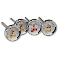 The problem with these and several other meat thermometers is that they are not based on modern world meat doneness guidelines AND they completely ignore the fact that the internal temperature rises after removing the meat from the oven or grill. For example, the scale of the beef thermometers in this set starts at 145 degrees and what they refer to as rare, so they are of limited use as an accurate thermometer for cooking beef anything less than medium well. In the real world rare is actually 120-130 degrees and if you want rare you have to remove it from the heat at 5-20 degrees (depending on the thickness) before reaching the desired final temperature. In the extreme case, if you wanted very rare and your target temperature was 120 degrees and your roast was about 4 inches thick, you would have to remove it when the internal temperature is 100 degrees and the residual cooking would raise the internal temp to 120. With this thermometer, none of these temps are even on the dial, so you would have to guess. Even Medium would be in the unscaled area of the dial. If you trusted this thermometer to cook your beef rare you would be removing the beef from the heat at 145 and after the internal temp raised to 165 it would be well done instead.These are a good idea however, for cooking on a spit because they can be left in while cooking and there are no cords that make electronic thermometers useless for spit cooking. Just remember to remove the meat from the oven or grill when the temperature is 25-50 degrees less than what the thermometer advises.