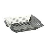 found this item to work well and was exceptionally sturdy and well built. Thick steel and heavy. Well pleased at this time with product.This is a great pan to grill veggies without fear of losing them through the grates on the grill. The pan is large enough to hold a lot of food, but is fine for small amounts too. I sprayed non-stick coating on it and grilled salmon on one half, veggies on the other. Easy soap and water clean up.